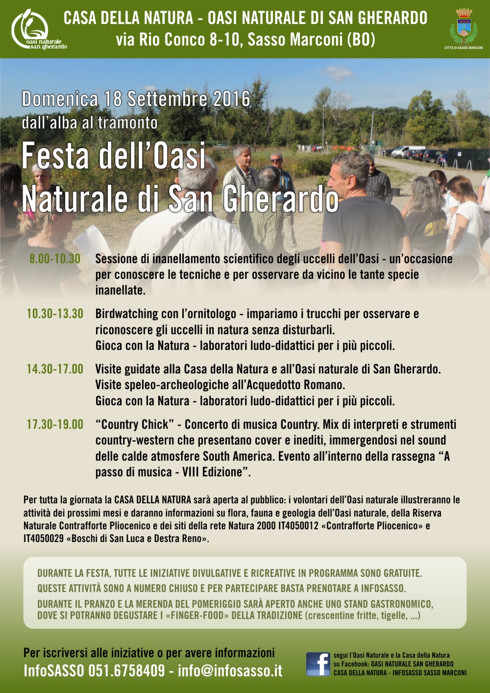 Il programma eventi (a cura di “Ecosistema” e Comune di Sasso Marconi) prevede: birdwatching per riconoscere e osservare gli uccelli in natura, visite guidate all’Oasi e alla ‘Casa della Natura’, visite speleo-archeologiche all’Acquedotto Romano con possibilità di esplorare un breve tratto della grande opera di ingegneria civile realizzata in età augustea per rifornire d’acqua la città di Bologna, i laboratori ludico/didattici “Gioca con la Natura” per i più piccini e il concerto di musica country “Country Chick” (nell’ambito del progetto di escursionismo musicale “A passo di musica” - a cura di Gruppo di Studi “Progetto 10 Righe” e Associazione “Le Rossignol”).