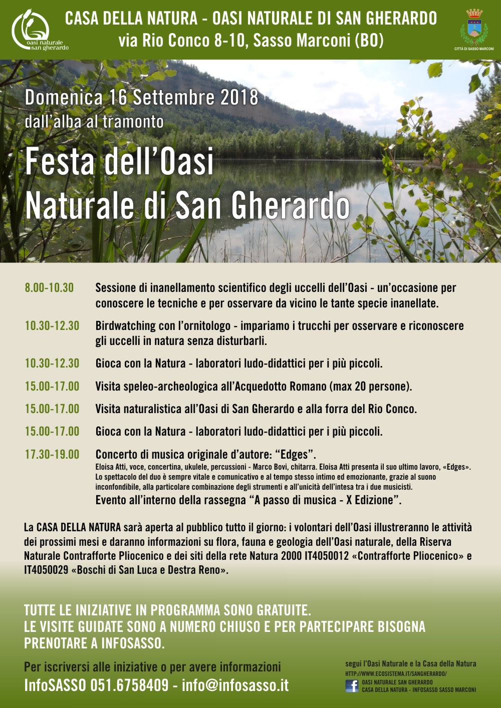 Il programma eventi (a cura di “Ecosistema” e Comune di Sasso Marconi) prevede: birdwatching per riconoscere e osservare gli uccelli in natura, visite guidate all’Oasi e alla ‘Casa della Natura’, visite speleo-archeologiche all’Acquedotto Romano con possibilità di esplorare un breve tratto della grande opera di ingegneria civile realizzata in età augustea per rifornire d’acqua la città di Bologna, e il concerto di musica originale d'autore “Edges” con Eloisa Atti (voce, ukulele, percussioni) e Marco Bovi (chitarra), nell’ambito del progetto di escursionismo musicale “A passo di musica”.